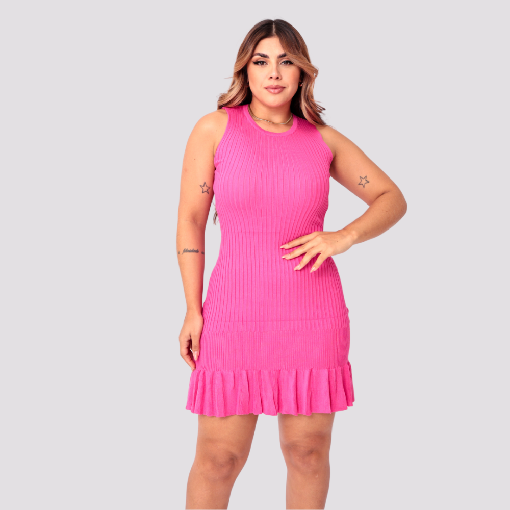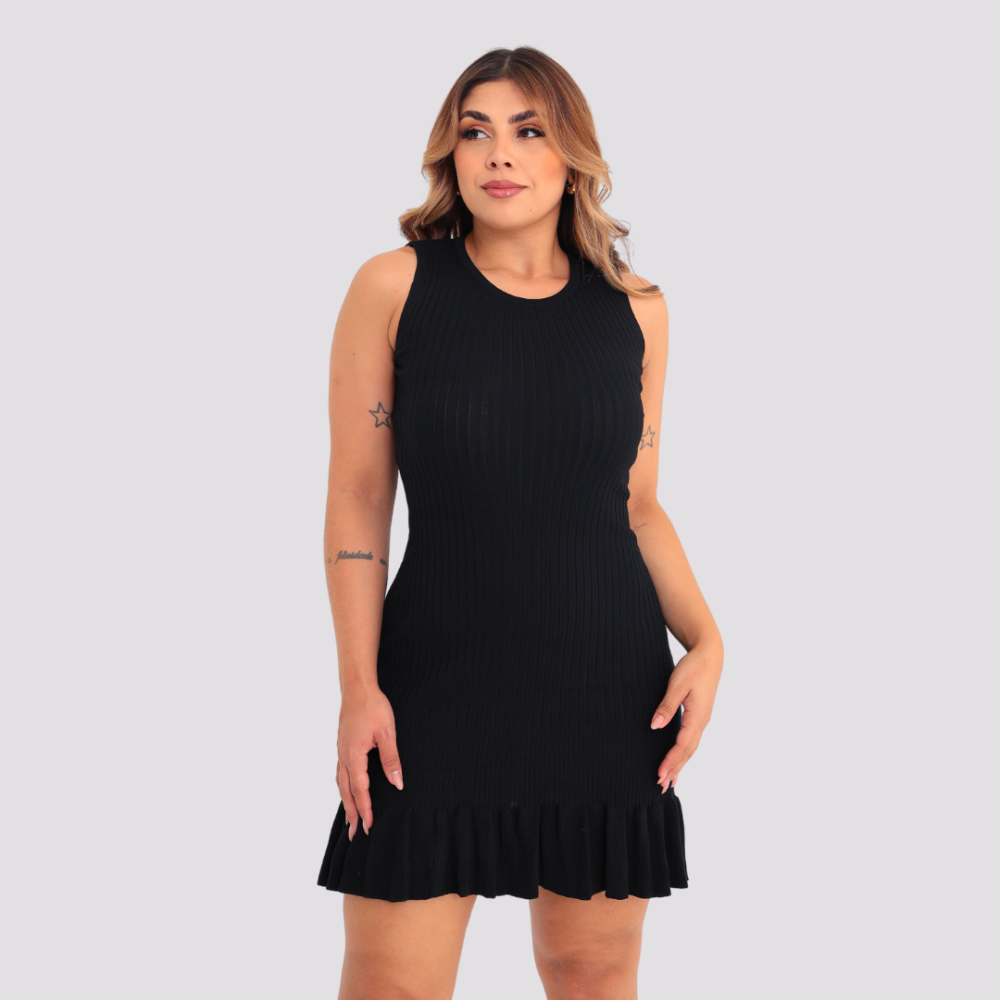VESTIDO DE TRICÔ CANELADO CAVADO COM BABADINHO NA BARRA